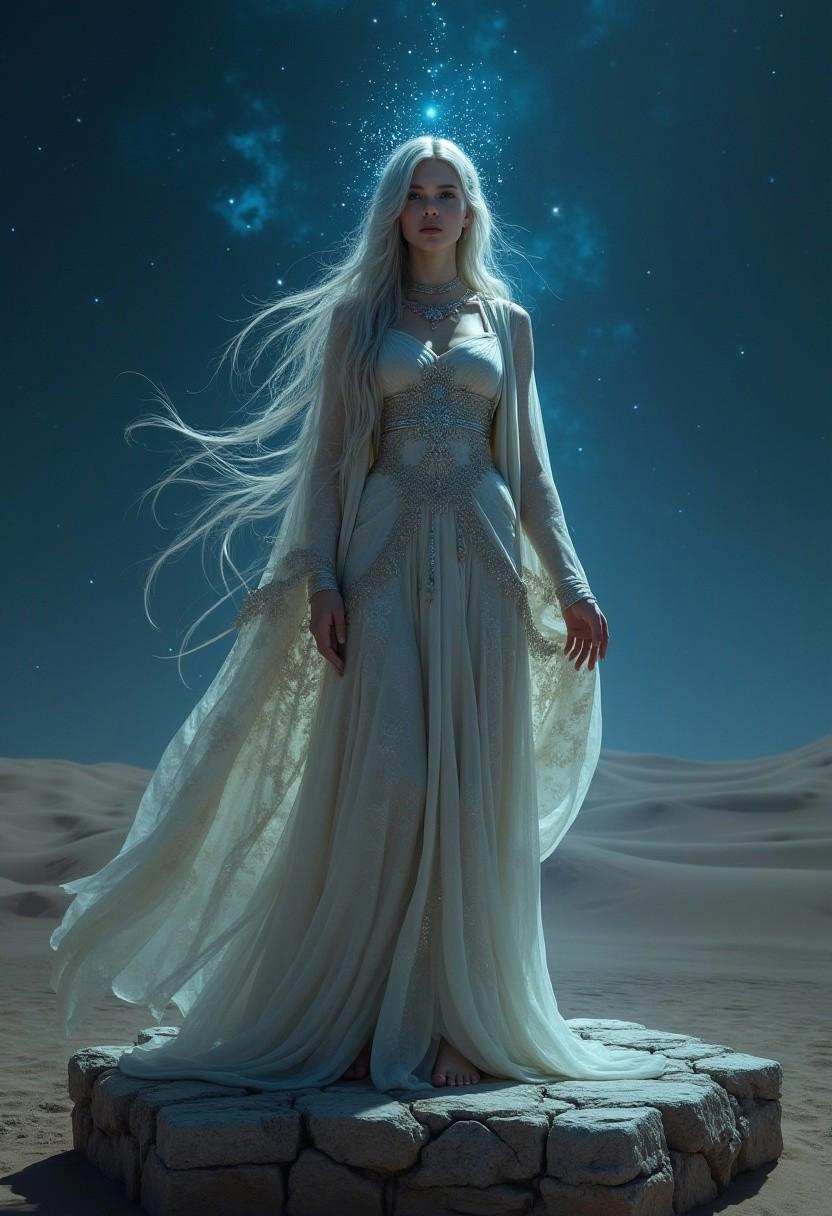 luis royo unites with photorealism, hyperrealism and hyperdetailing ,a UHD masterpiece photography. Celestial Sorceress in a Moonlit Desert "A celestial sorceress standing on an ancient stone altar in the middle of a vast, moonlit desert. Her robes are delicate, ethereal fabrics adorned with intricate patterns and stardust that glows faintly. Long, silver hair flows behind her, and her eyes sparkle with wisdom and mystery. The night sky, filled with stars and constellations, illuminates the scene with a soft, bluish glow. Extreme hyper-realism captures every fold of fabric, every speck of sand, and each glint of moonlight in a stunning UHD composition, rendered in Octane for impeccable detail."