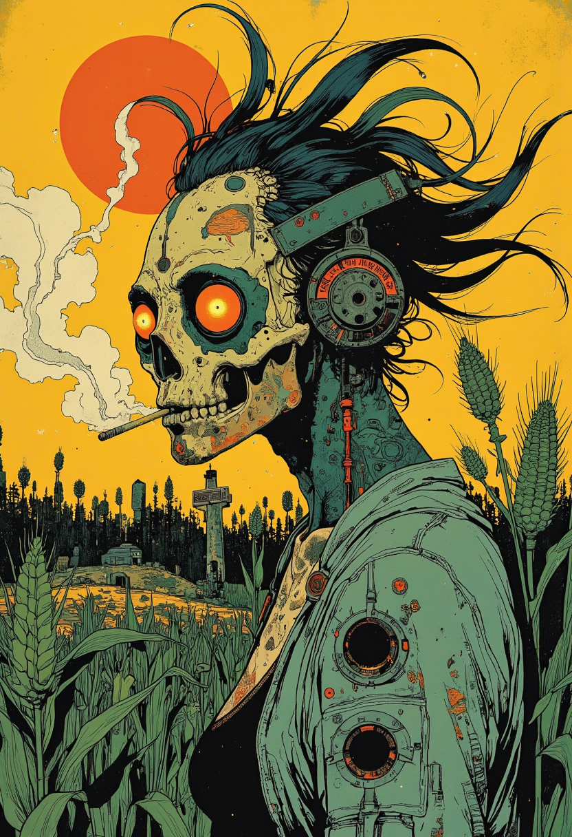 Anthro corn medusa monster wearing skull mask cult and tribal corn shaman, tribal tattoo pointillism and engraving style, by Jon Klassen, on corn fields, smoking cigarette vector illustration superflat 2d linocut <lora:Luminous_Shadowscape-000016.safetensors:0.6:1> <lora:Illustration concept variant 1 v2.safetensors:0.5:1.0> <lora:CPA.safetensors:0.6:1.0> <lora:dark_fantasy_flux.safetensors:0.6:1.0>