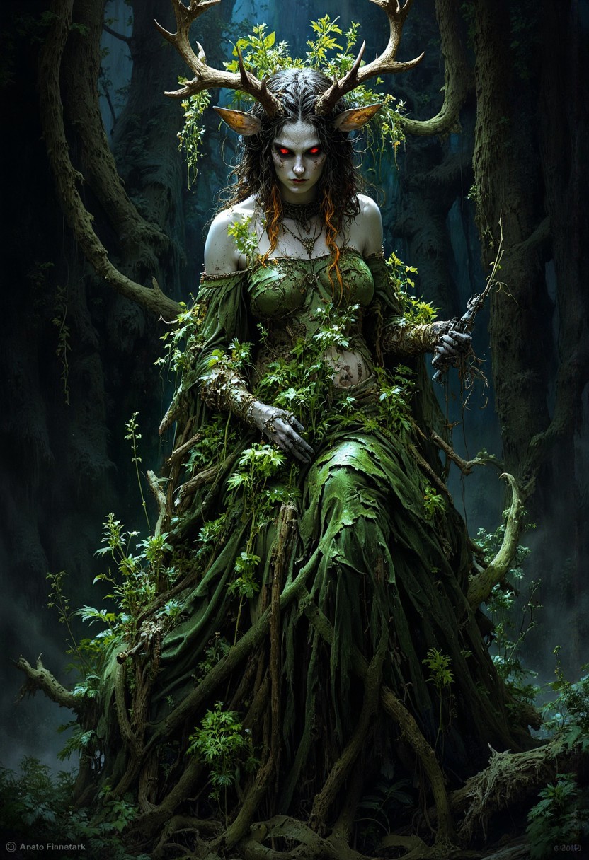 An evocative dark fantasy illustration by Anato Finnstark and Greg Rutkowski. The central figure is a once-elegant forest nymph, now corrupted by sinister forces. She has deer-like attributes, a pale complexion, glowing red eyes, and jagged antlers. Her once-lush attire is now tattered and overgrown with the very greenery that she once represented. The background is dark and foreboding, reflecting the nymph's lost beauty and anger. The overall atmosphere is cinematic and conceptual, immersing the viewer in a world of dark fantasy., cinematic, conceptual art, dark fantasy