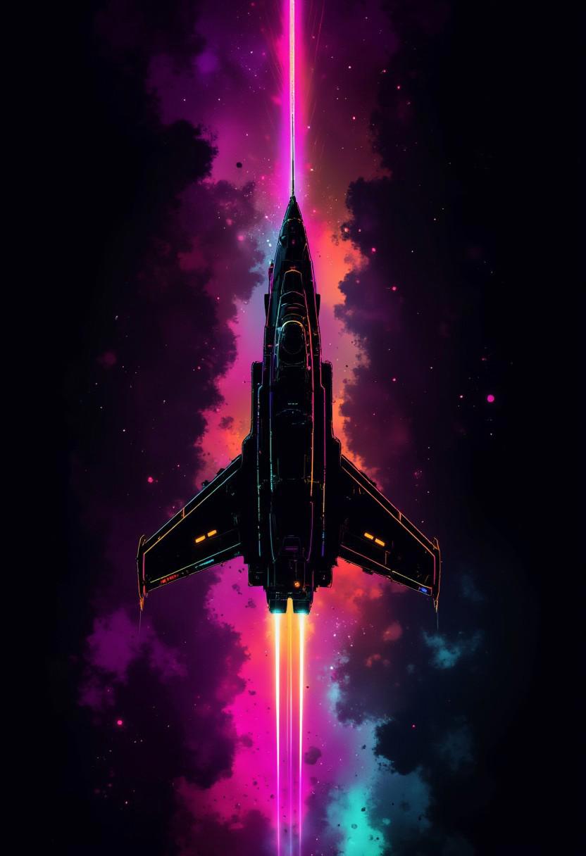 lifelike, silhouetted outline against a dark background, rainbow colours, a long sleek starfighter spaceship with neon plasma cannons on the wings, stars, nebulas, ck-rw, in the style of ck-rw,