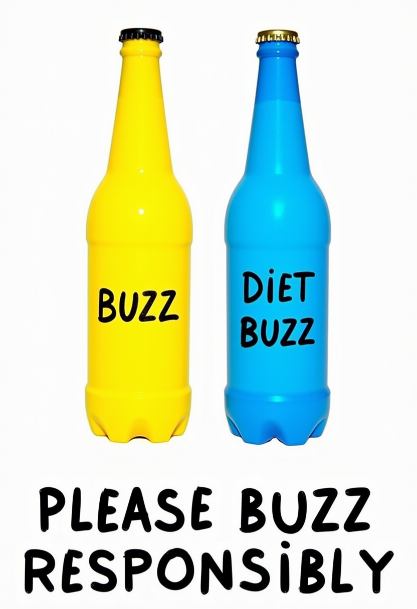 A yellow pop bottle labelled with the text: "BUZZ" next to a blue pop bottle labelled with the text: "DIET BUZZ". At the bottom is the meme text: "PLEASE BUZZ RESPONSIBLY". aidmaTextImprover, <lora:TextimproverV0.4:1>