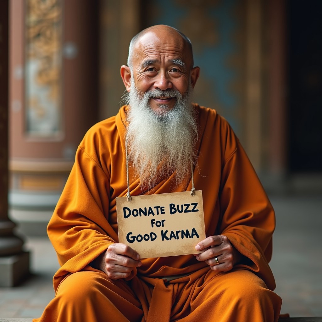 a friendly Buddhist monk with a sign that says "Donate Buzz for Good Karma", old man, he is sitting at a temple, realistic