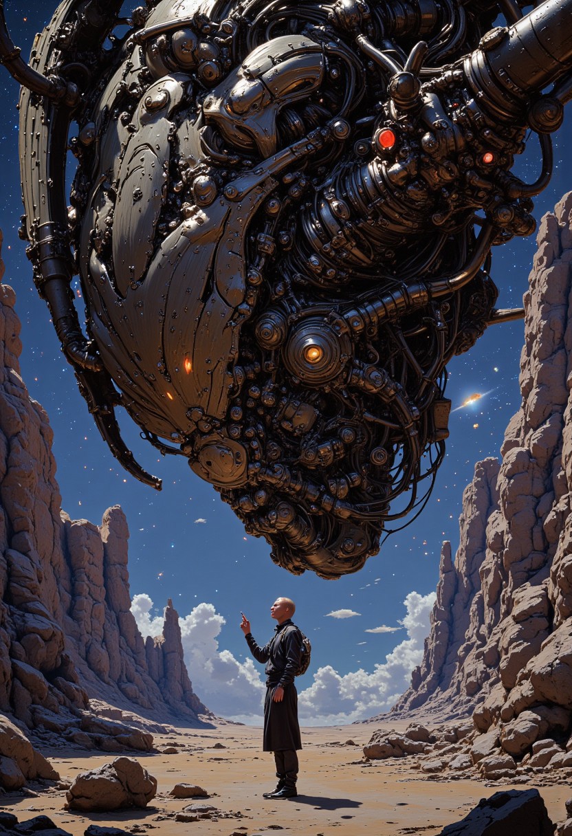 In a surreal alien landscape inspired by the works of Moebius and Chris Foss, a colossal, mechanical creature looms over a barren terrain. Its intricate design features vibrant colors and fluid lines, reminiscent of comic book artistry blending into reality. The background showcases towering rock formations painted in iridescent hues, while a sky filled with swirling galaxies and cosmic phenomena creates a sense of infinite wonder. In the foreground, a small, humanoid figure in a sleek spacesuit stands, gazing up in awe, holding a glowing orb that pulses with energy. The atmosphere is charged with mystery and adventure, as if inviting the viewer to explore the unknown depths of the universe, blending whimsy and terror in a beautiful chaos.D4rkCyb3rDyn34n1m3 style, S1n0z1ck style, perfection style