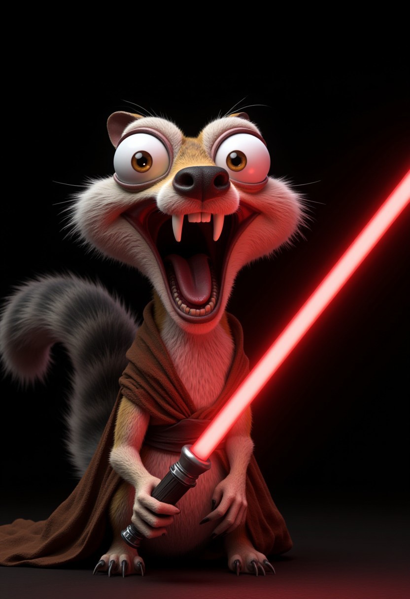 Create a close-up, dynamic portrait of a quirky, prehistoric squirrel with wildly bulging eyes and scruffy fur, reimagined as an evil Jedi. His wide-open mouth is frozen mid-scream, revealing sharp teeth, and his crazed expression radiates madness and dark power. He wields a glowing red lightsaber, the fiery glow reflecting off his wide, manic eyes and scruffy fur. His bushy tail arches behind him, adding to his dramatic silhouette, and he wears a tattered Sith robe that drapes menacingly over his small frame. The plain, dark background enhances the focus on his chaotic energy and villainous presence. Rendered in 8k resolution, with hyper-realistic textures capturing the chaotic detail of his fur, eyes, and the dramatic lighting from the lightsaber, creating an intense and cinematic masterpiece