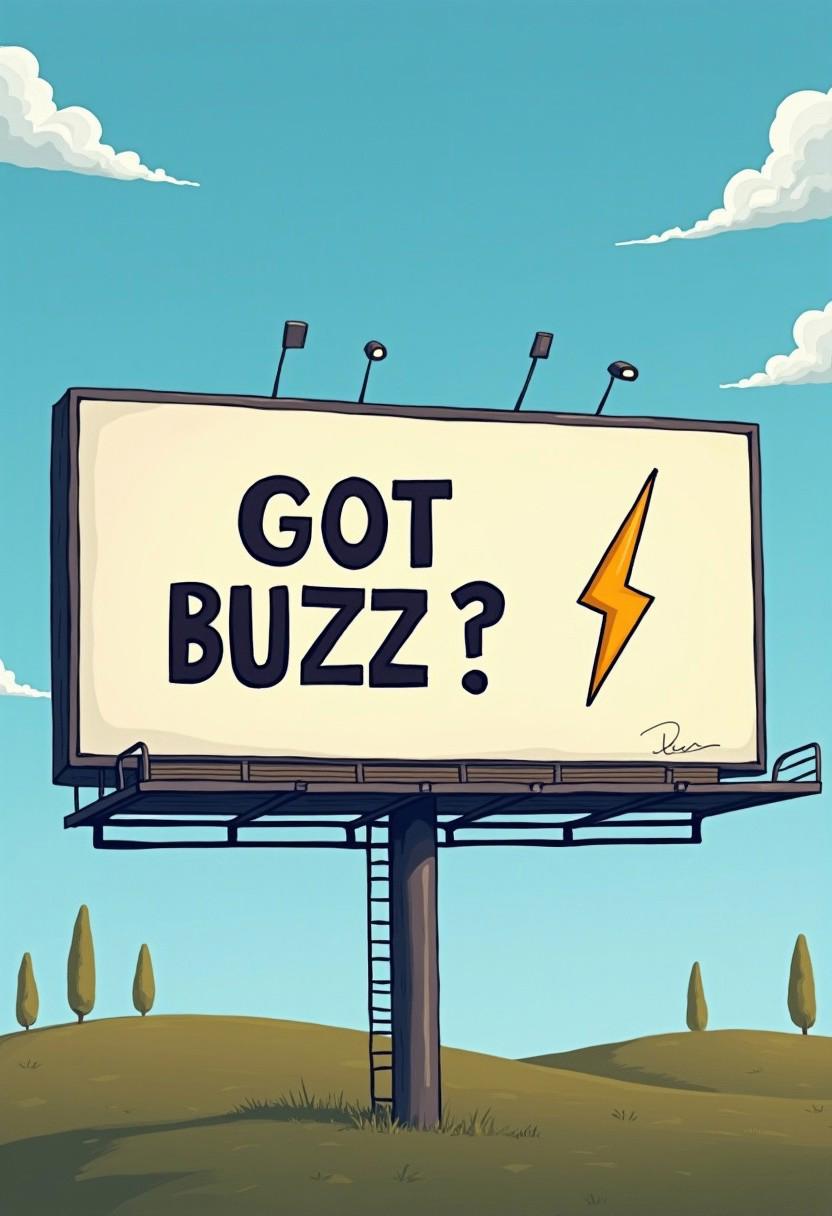a large billboard that reads "Got Buzz ? ", with a cartoon lightning bolt symbol next to the writing, no people.