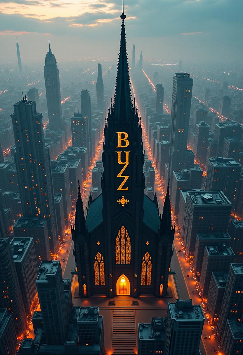 Aerial view of a modern dark and futuristic dystopian megacity with skyscrapers around a big dark skyscraper cathedral. On the top of the church is written "Buzz" in golden letters. The church is tooled with light golden ornaments.