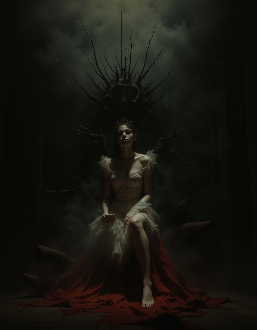 a high-quality, cinematic photo manipulation of a chilling female horror show, emphasizing the concept of (reality). The image features eerie lighting, dark shadows, and a sense of unease. A young beautiful is depicted in a haunting pose, evoking fear and suspense. She is barefoot. The setting is a surreal blend of disturbing elements that blur the line between reality and nightmare. This digital artwork explores the depths of human psyche, playing with the viewer's perception of what is real and what is imagined. The overall mood is highly atmospheric, drawing the audience into a world where the woman embodies the essence of fear itself. Perfect for fans of psychological horror and surreal art. horror show 3th33r34l <lora:ethereal-grace:0.5>, <lora:flux.1_lora_flyway_Epic-detail_v2:0.8>âââ