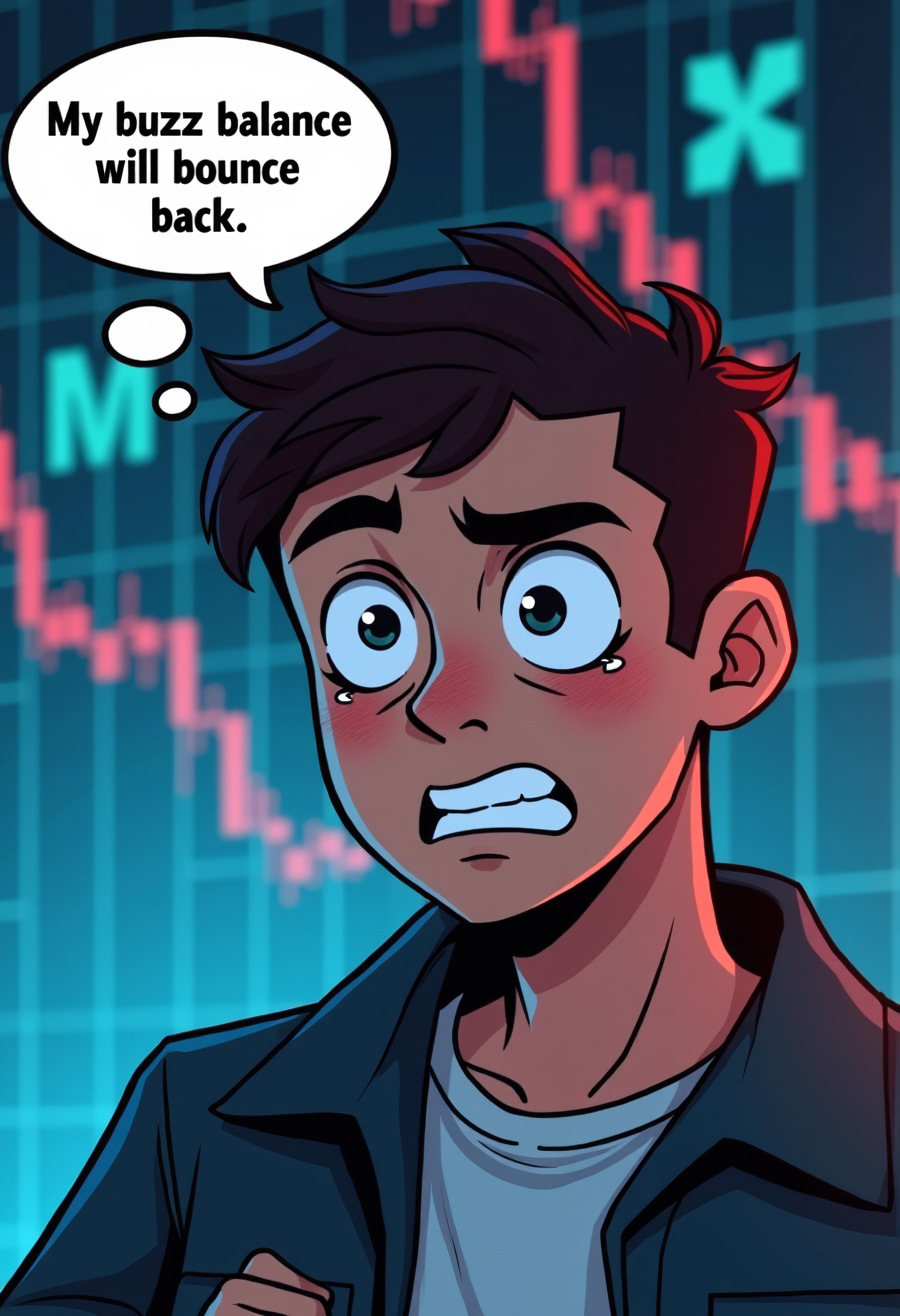 a young sad man with tears in his eyes, with a worried grin watches stock market charts plunging into the negative. A text bubble beside him reads, 'My buzz balance will bounce back,' as he tries to stay hopeful amidst the financial losses