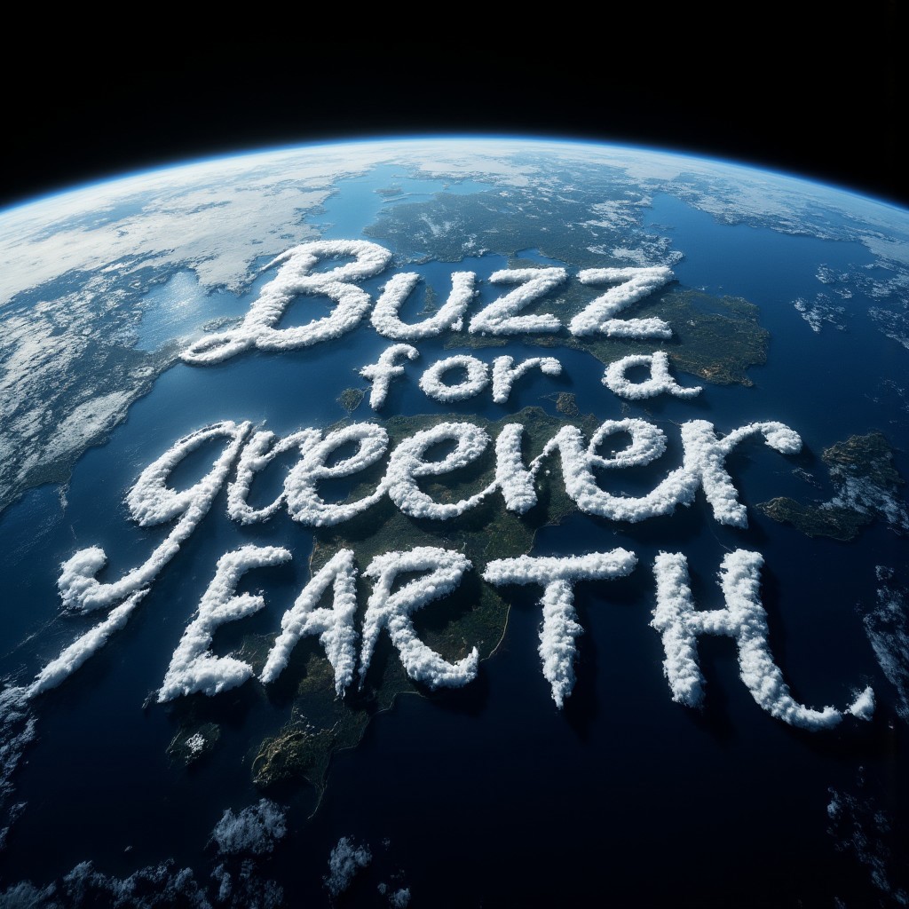 ((aidmaimageupgrader)), “A hyper-realistic, ultra-high-definition view of Earth from space, capturing the planet against the vast, dark expanse. Across the curvature, sweeping white clouds form a striking message: ‘Buzz for a Greener Earth,’ their letters gently swirling over the blue oceans and green continents below. Each cloud-letter is naturally wispy yet distinct, as if shaped by the planet’s winds, catching sunlight along their soft edges. The focus is on the Earth’s beauty and fragility, with the message blending into the natural patterns.”