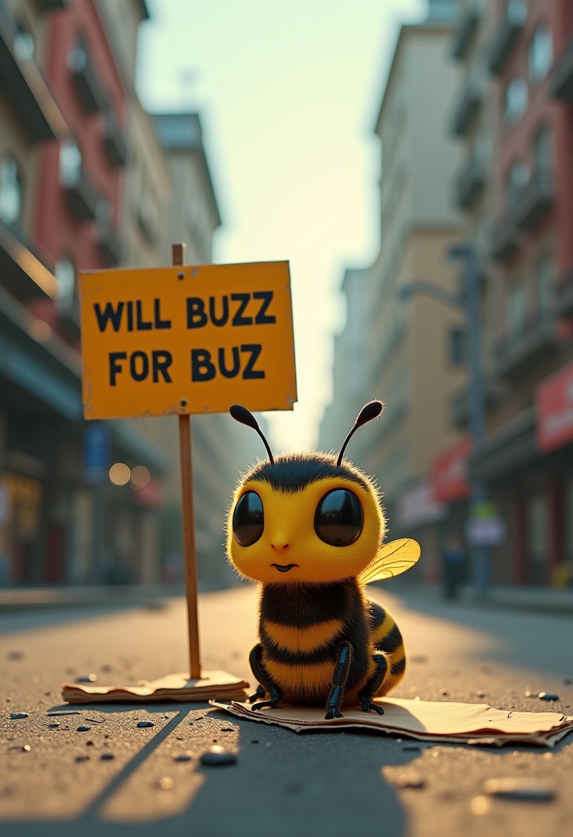 masterpiece, best quality, highly detailed, score_9, score_8_up, score_7_up, BREAK, 70mm lens, full-color photograph, shadows, cinematics lighting, volumetric lights, realistic lights, three quarter view, film grain, photograph of a tiny cartoonish bee, looking desolate, in an empty city, sitting on a piece of cardboard, a huge sign next to him that says "will buzz for buzz"