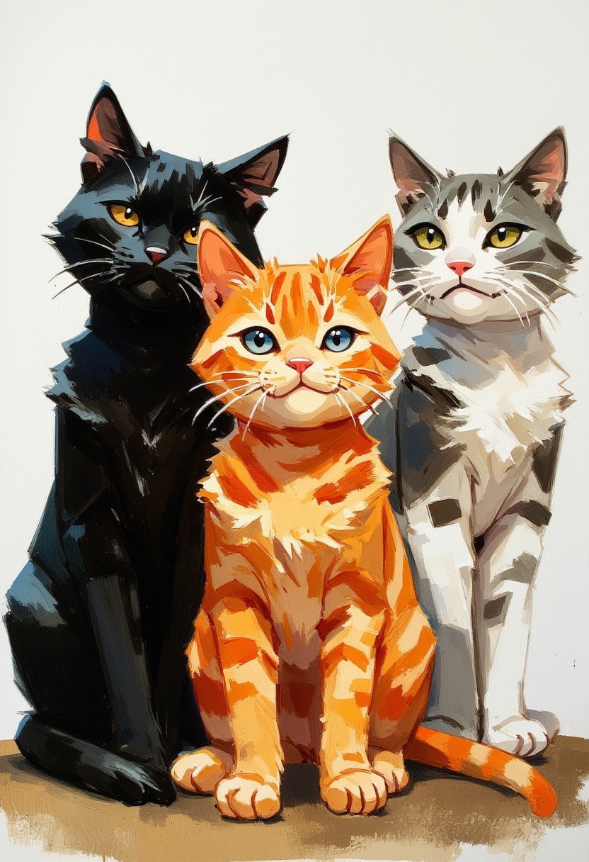 oil painting of 3 kittens in a row doing the hearing seeing speaking poses. They are a black cat,an orange tabby cat and a calico cat. in the style of frank frazetta