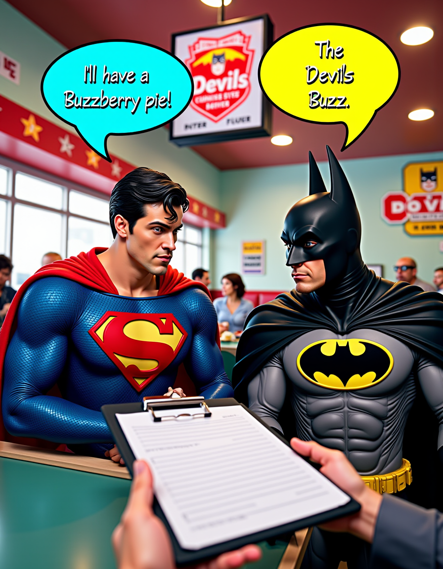 Superman and Batman sitting at a diner. Superman and Batman look towards the viewer. It's a POV shot where the viewer holds a clipboard, taking their orders. A speech bubble coming from Superman shows the blue text: "I'll have a Buzzberry pie!". A speech bubble coming from Batman shows the yellow text: "The Devil's Buzz.". aidmaTextImprover, <lora:TextimproverV0.4:1>