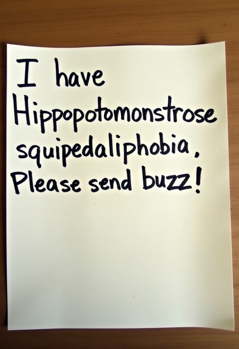 A photo of a handwritten note that reads "I have Hippopotomonstrosesquipedaliophobia. Please send buzz!"