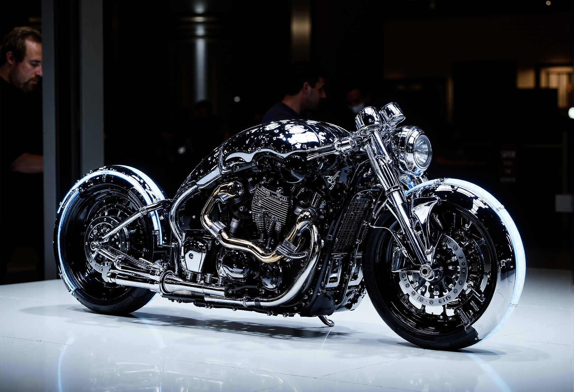 cyberpunk motorcycle, futuristic,, exposed gears and pipes, sleek glowing neon accents, standing in a modern showroom, white tiled reflective floor, , clean minimalist background, dramatic shadows, highly detailed, vibrant, cinematic presentation. <lora:aidmaMJ6.1-FLUX-V0.1.safetensors:1.0>, <lora:aidmaHyperrealism-FLUX-V0.1.safetensors:0.65>, <lora:- Flux1 - vanta_black_V1.0.safetensors:0.75>, <lora:flux.1_lora_flyway_Epic-detail_v2.safetensors:1.0>,
