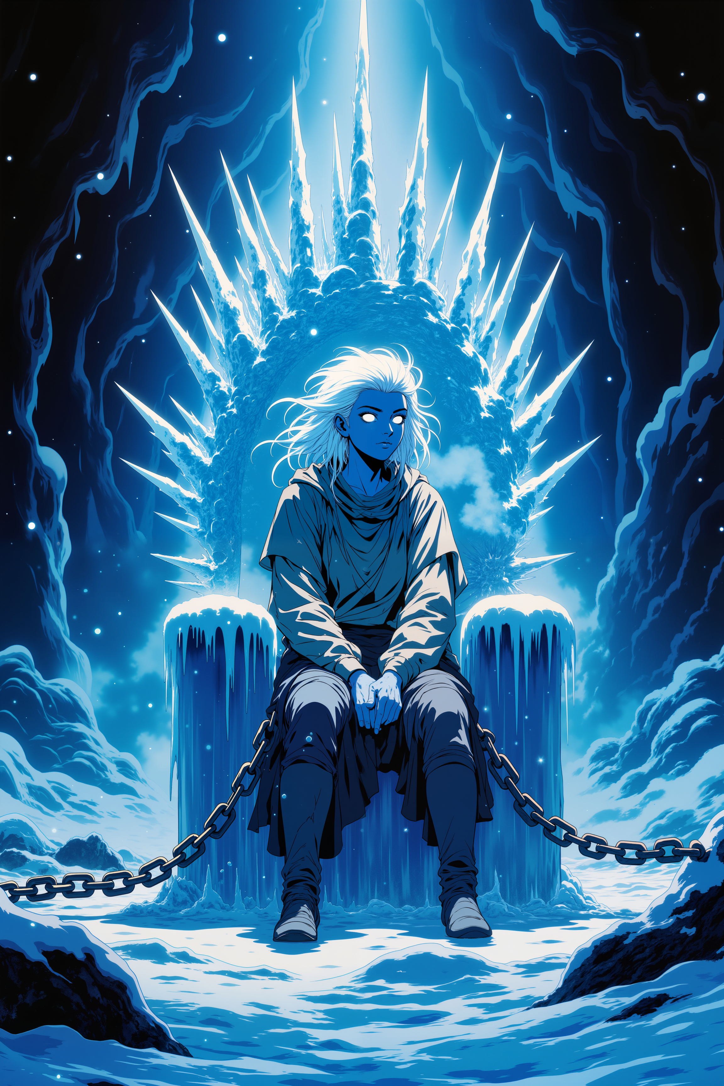 ne0nfant4sy, In a massive chamber carved from solid ice, a figure with translucent blue skin and hair like frozen mist is chained to an icy throne, her cold, glowing eyes staring out over a desolate frozen wasteland. The throne is adorned with sharp, jagged icicles that glisten in the faint light filtering through the cavern walls, and her chains, made of enchanted frost, shimmer with a soft, white glow. Her breath forms small clouds in the frigid air, and her torn clothing clings to her skin, barely providing warmth against the biting cold. The walls of the chamber are covered in intricate frost patterns that seem to shift and move, reflecting the light in dazzling, crystalline rainbows. Above, the ceiling is a mass of frozen stalactites, some of which drip with freezing water that forms small, glistening pools on the floor. The air is still and silent, save for the occasional creak of the ice as it shifts under the weight of centuries. Outside the cavernâs entrance, an endless expanse of snow and ice stretches out, the wind howling across the frozen landscape like a distant, mournful song. The atmosphere is one of frozen eternity, where time itself seems to have stopped, trapping the figure in a prison of cold and isolation.<lora:RetroAnimeFluxV1:0.5><lora:NeonFantasyFLUX:0.3>