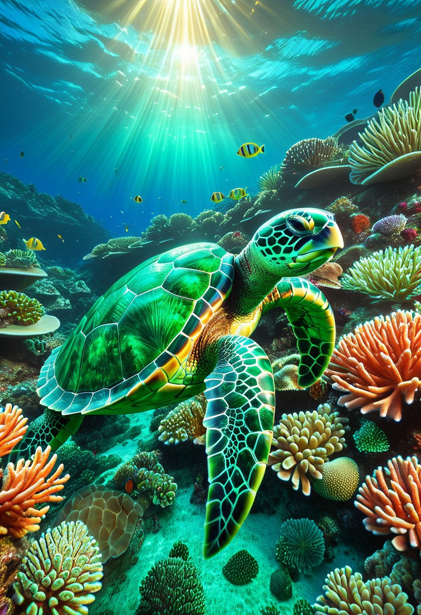 score_9, score_8_up, score_7_up, emeraldmorph, majestic sea turtle, intricate emerald shell patterns, swimming in a coral reef, glowing bioluminescent plants, dynamic lighting, underwater scene, high detail, photorealistic, serene
