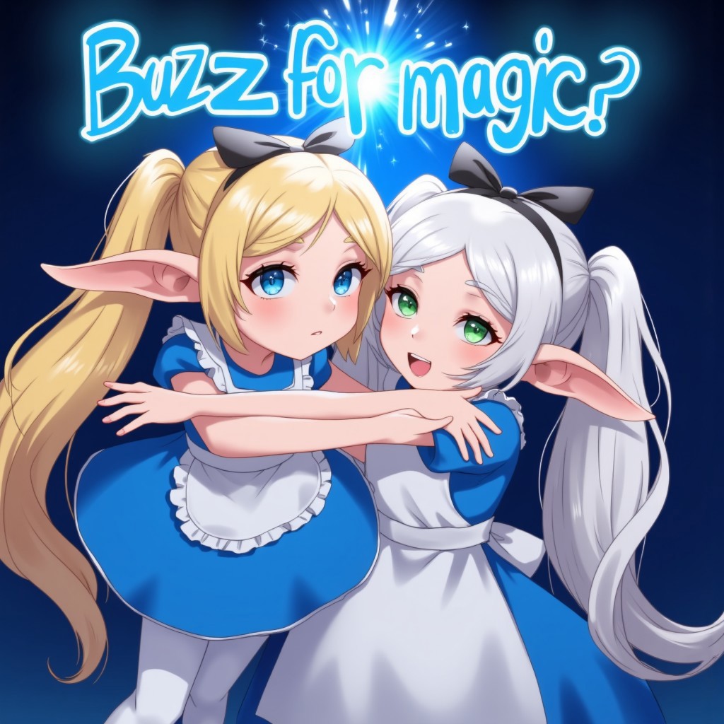 AliceWaifu, blue eyes, blue dress, white pantyhose, apron, black bow, blonde, nereirfpnxl, frieren, elf, pointy ears, green eyes, white hair, twintails ((Fusion of Alice and Frieren using magic to make the words "Buzz for magic?" above their heads, solo, 1girl))