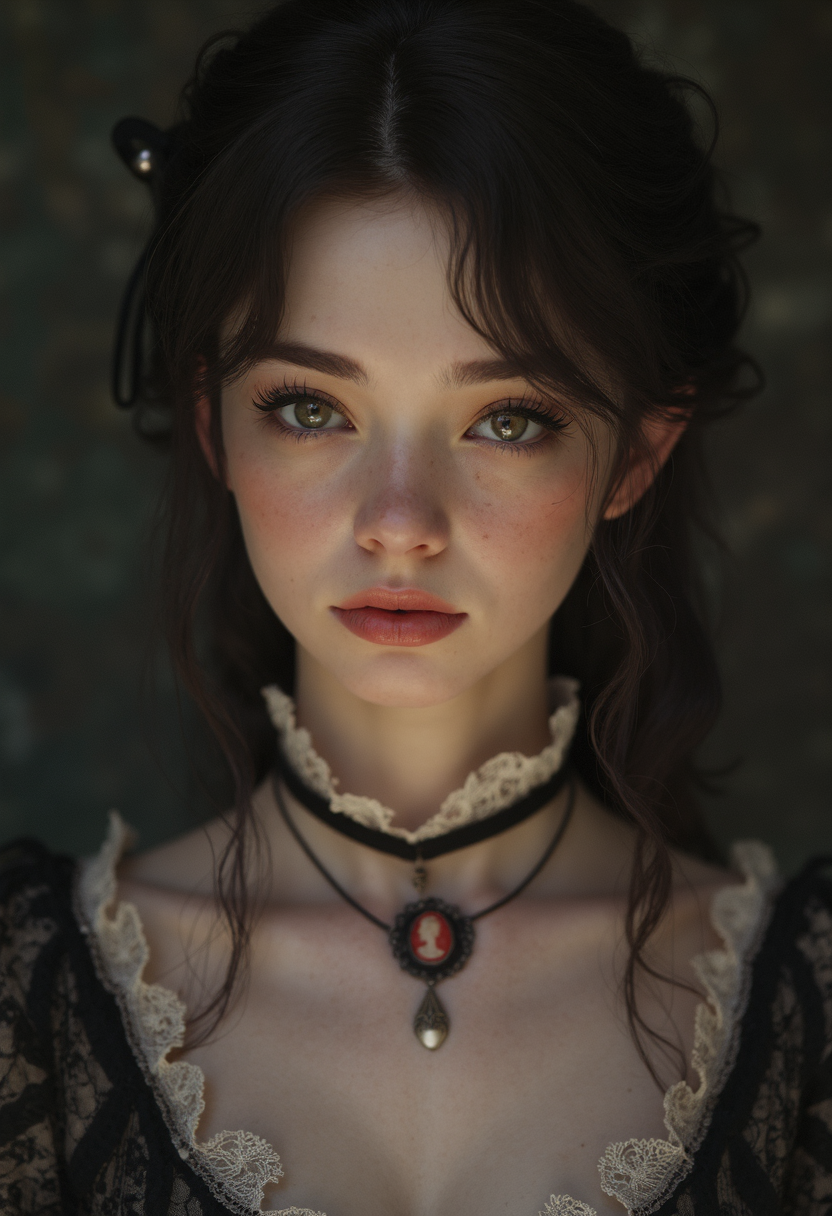 A high-resolution, waist up portrait of a young woman in her early twenties with a soft, innocent expression, exuding a sense of Victorian elegance. She has fair, porcelain skin and wide, doe-like eyes that sparkle with a hint of mystery. Her lips are painted a gentle rose shade, slightly parted. Her dark, wavy hair is styled in an elegant Victorian updo adorned with a lace ribbon. She wears a vintage, dress with intricate lace details and a cameo brooch at her neck, evoking both innocence and old-world charm. The background is dimly lit, with shadows that seem to subtly encroach, adding an eerie, gothic atmosphere to the scene. Soft, diffused lighting highlights her delicate features, casting a gentle glow over her pale complexion, giving her an ethereal, haunting beauty that feels both inviting and unsettling glow effects, godrays, Hand drawn, render, 8k, octane render, cinema 4d, blender, dark, atmospheric 4k ultra detailed, cinematic, Sharp focus, big depth of field, Masterpiece, colors, 3d octane render, 4k, concept art, trending on artstation, hyperrealistic, Vivid colors, extremely detailed CG unity 8k wallpaper, trending on CGSociety, Intricate, High Detail, dramatic intricate, detailed . magnificent, celestial, ethereal, painterly, epic, majestic, magical, fantasy art, cover art, dreamy
