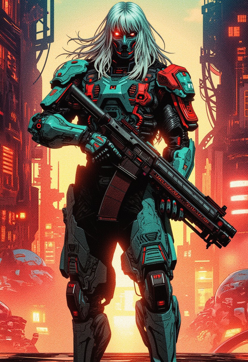 Abstract digital painting in the style of ck-js, concept art, futuristic, cyberpunk cyborg faceless warrior, teal and red power armour, long flowing silver hair, bangs, standing on street of futuristic sci-fi city, holding large laser rifle, towers, domes and skyscrapers, sunset, rule of thirds, perfect lighting, sunset, HD32K, wallpaper, hyperdetailed