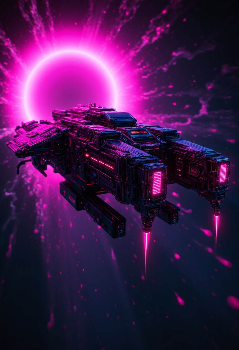 mad-cbrpnksplshrt, silhouette art, chiascuro, cyberpunk, a_skynet_cyberdyne_systems_craft, the image is featuring an armored futuristic spaceship, adorned with intricate, metallic details, including bolts, wires, and mechanical components, giving it a highly advanced, industrial look, with glowing red diodes and LEDs, illuminated cockpit, emerging from a wormhole in space, vibrant neon colours with motion blur, viewed diagonally from the front, directional lighting, silhouetted, light hitting one side, ck-rw, in the style of ck-rw,