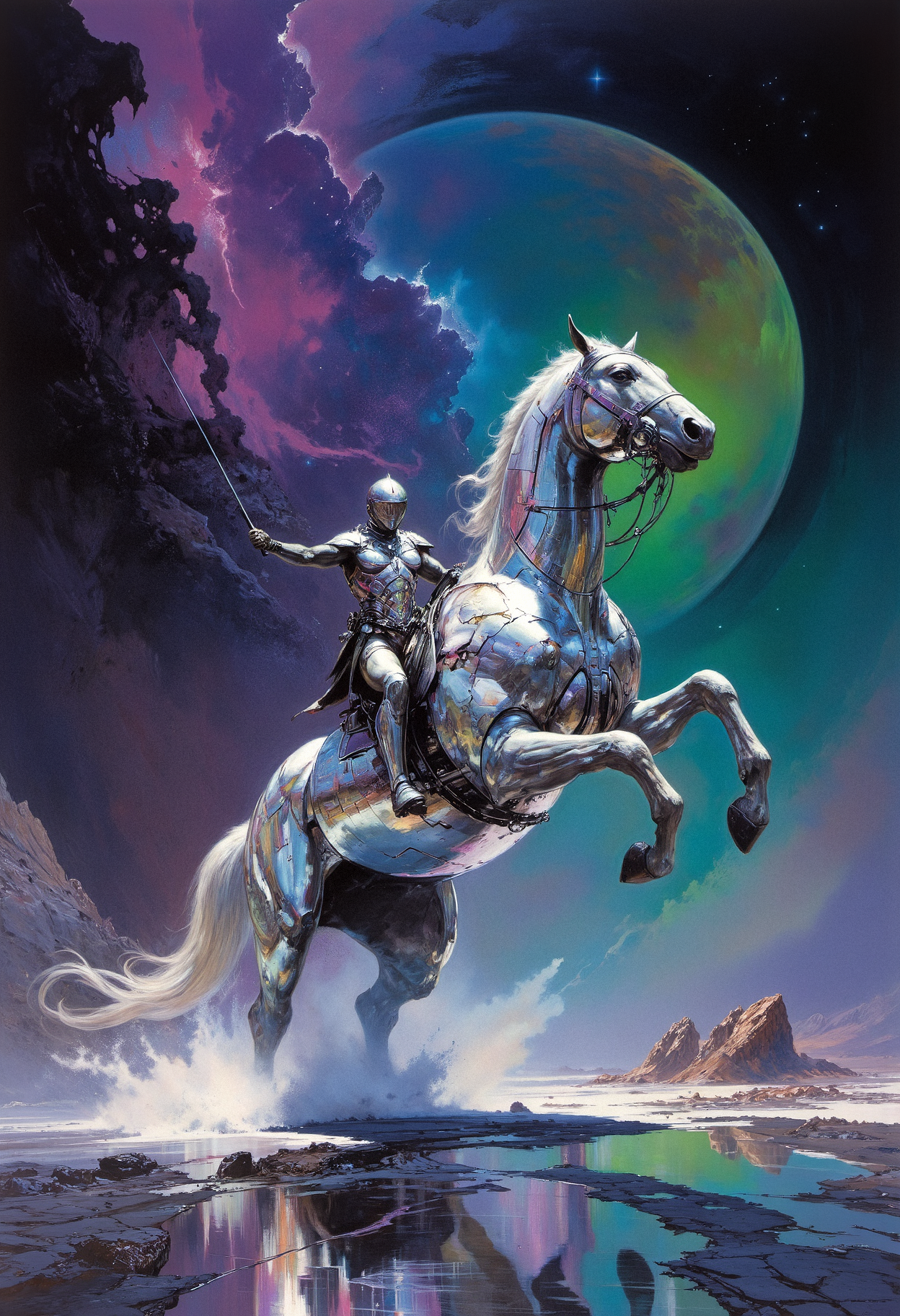 A futuristic warrior riding a massive mechanical horse made entirely of mirrors. The warriorâs armor is composed of holographic shards that shift in color and reflect the surrounding landscape in dazzling fragments. The horse gallops across a shimmering, reflective surface that stretches infinitely in all directions, like a liquid mirror. Above, a vast nebula swirls in vibrant hues of purple, blue, and green, casting surreal reflections across the mirrored terrain. The entire scene is bathed in a glowing, otherworldly light, as the horse and rider appear to be racing through both space and time. <lora:artisketchyfs-v02:0.83> <lora:FLUXRetroSciV3:0.53> RetroSci style, <lora:flux.1_lora_flyway_Epic-Characters_v1:0.43> <lora:frazetta_flux_v2-000150:0.33> Frank Frazetta fantasy oil painting,
