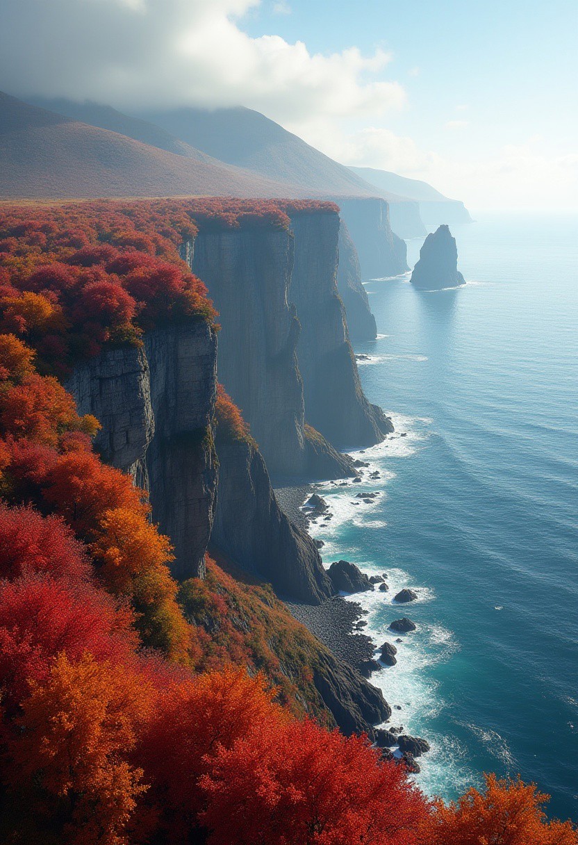 High coast, cliffs in near horizon. Red and yellow leaves. Different biomes. Highly detailed, realistic textures, clouds and atmosphere.
