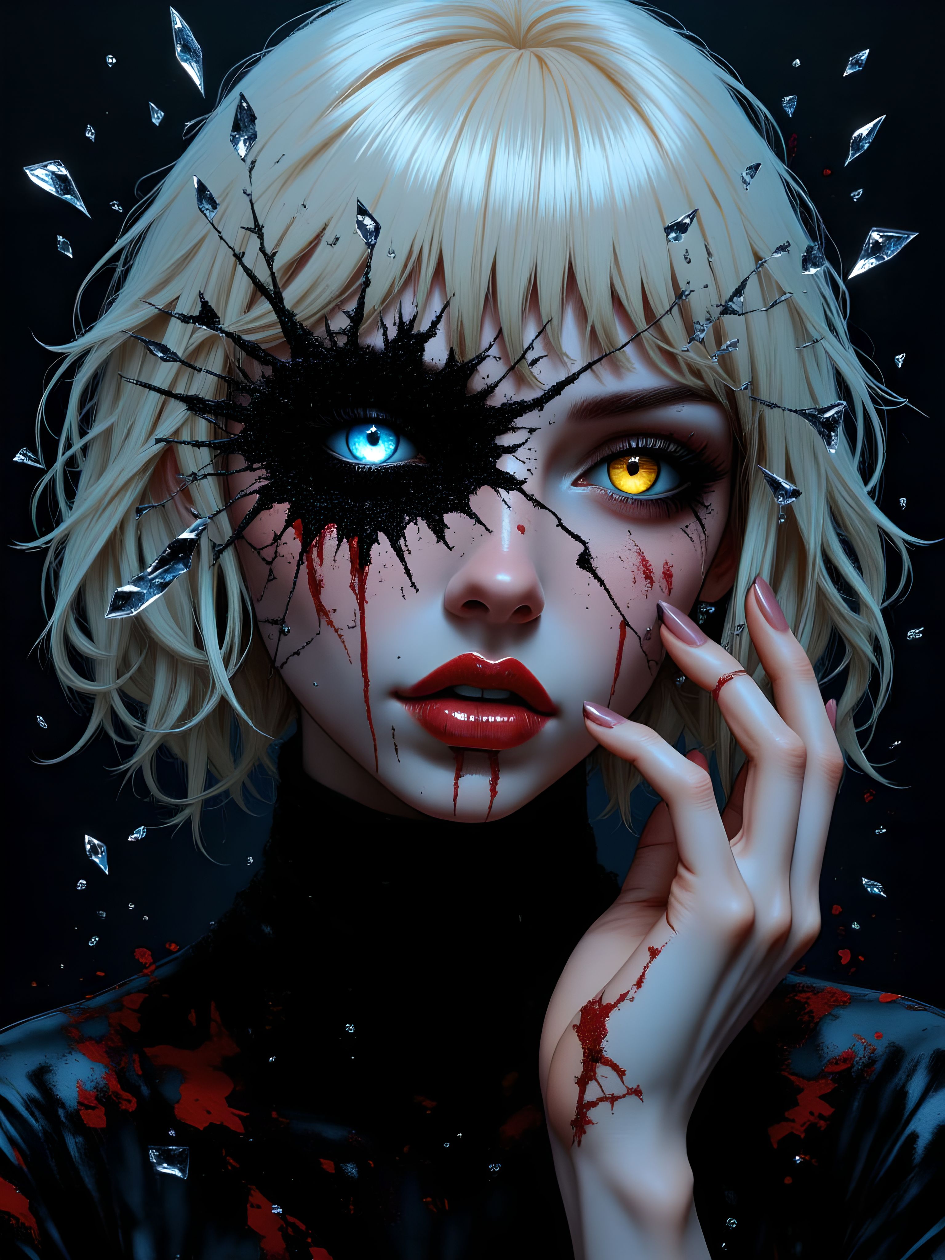 An emotionally intense and surreal masterpiece capturing a dual persona, portrayed through the disintegration of the character’s face and body. The scene is set in a dark, ethereal nighttime atmosphere, with the character’s cracked skin and glowing eye contrasting against the darkness. Their hair is crystal-like, shimmering with a soft, unnatural shine, and their colored eyelashes stand out dramatically. The abstract, oil painting style adds depth and texture, with broken glass shards scattered across their face, reflecting the fragmented and corrupted nature of the character. The character’s pose is dynamic and powerful, with one hand reaching toward the viewer, their body seemingly shattering and split apart. Blood drips from their eyes, and the cracks on their skin suggest an inner struggle, symbolizing the duality of their nature. A glass shard overlays one of their eyes, adding to the feeling of possession and corruption. The reflection in the shards and the variations in the character’s facial expressions further emphasize the time paradox theme, where the clock's hands suggest a distortion in time and reality. Their heterochromatic eyes represent the contrasting personas, with one eye glowing intensely, while the other is shrouded in shadow. aidmaimageupgrader, aidmaMJ6.1m, detailmaximizer, mythp0rt, ne0nfant4sy, drkfnts <lora:aidmaImageUpgrader-FLUX-V0.2:0.8> <lora:aidmaMJ6.1_aidmaMJ6.1-FLUX-v0.4:0.8> <lora:v1v1dr34m:0.68> <lora:aesthetic2-cdo-0.5:0.62> <lora:mythp0rt_FluxMythP0rtr4itStyle:0.6> <lora:ne0nfant4sy_NeonFantasyPrimeFLUX-000049:0.66>