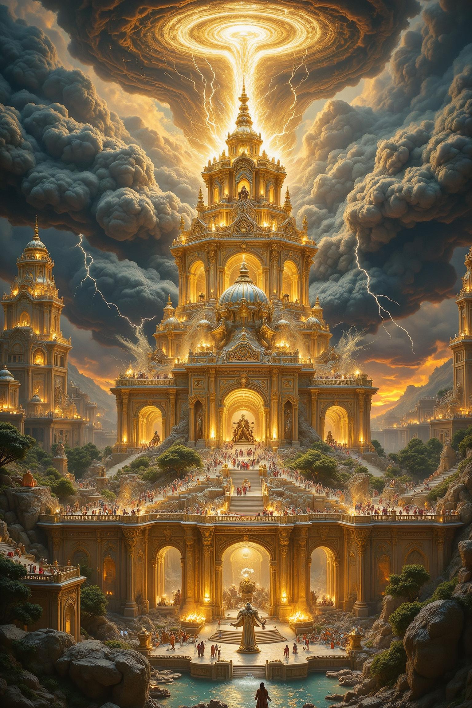 An ethereal, golden palace floats amidst storm clouds, partially crumbling and engulfed in flames as chaos erupts. Gods of various mythologies clash in mid-air, each wielding their own unique elemental powers. The sky is a riot of color with streaks of lightning and swirling vortexes. Debris and divine light blend together, giving a sense of grandeur and destruction. The scene is filled with intricate architecture and detailed figures, rendered in a high-contrast, hyper-realistic style. <lora:Flux DetailerV2:0.8> <lora:aidmaFLUXpro1.1:0.6> aidmafluxpro1.1 <lora:aidmaMJ6.1v0.4:0.6> aidmaMJ6.1 <lora:detailed city by Kanto:0.7> detailed city