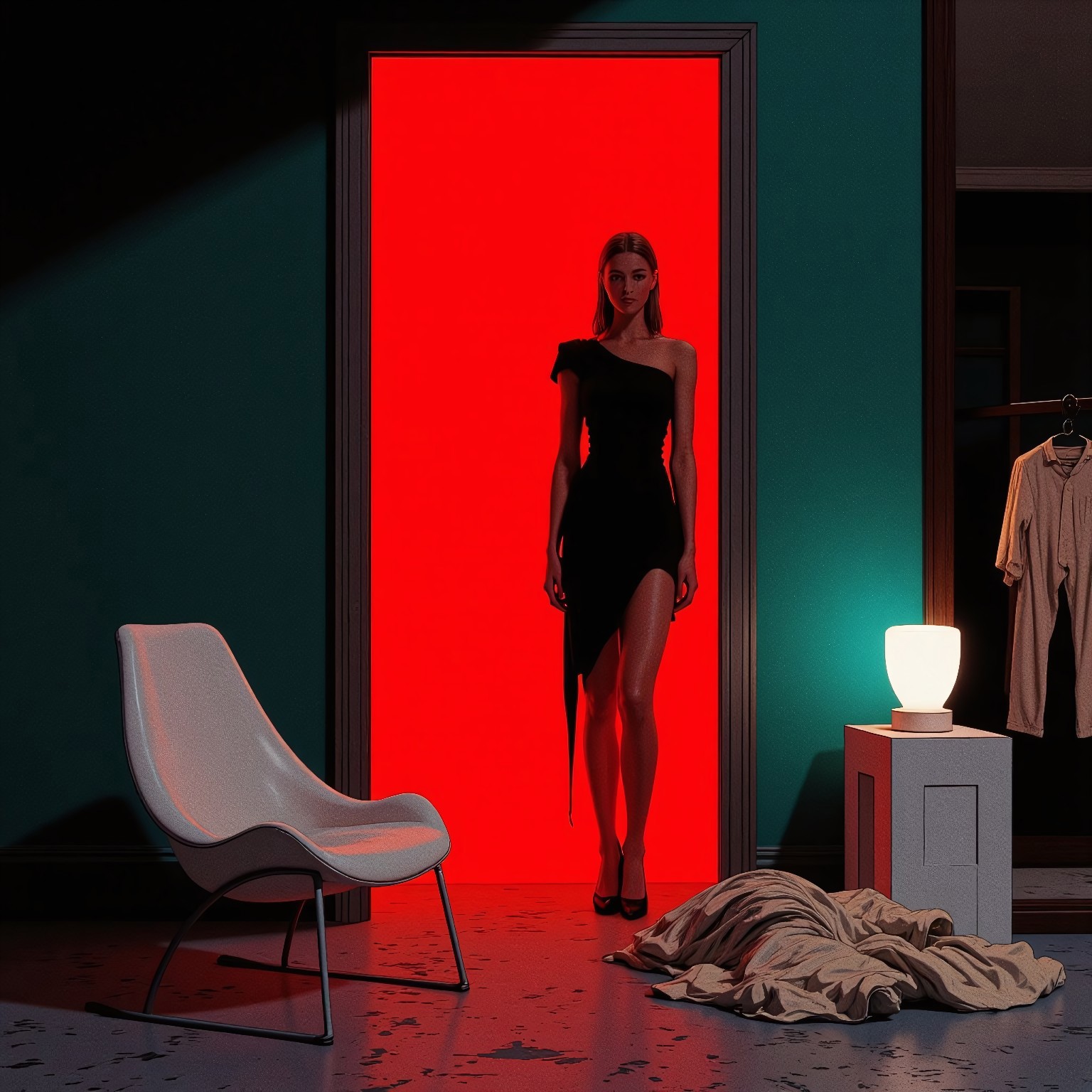 This image is a digital rendering in a stylized, abstract art style, set in a dimly lit room with a contrasting color scheme. The walls are painted deep teal, and the floor is a muted gray, creating a moody atmosphere. An open doorway reveals a woman standing in the next room, and bathed in a striking red light. The red glow illuminates her slender, athletic frame, casting a warm contrast against the cool teal surroundings. She is wearing a black asymmetrical Avant Garde inspired dress, which drapes comfortably over her body, adding a sense of relaxation and intrigue. In the foreground, a modern white chair with a curved backrest is positioned to the left. To the right, a small square white table holds a white, cylindrical lamp emitting soft, diffused light. On the floor beside the table, a pile of clothes, including a striped shirt and pants in shades of white and beige, adds a touch of disarray, contrasting with the otherwise minimalist surroundings. The background is barely visible but suggests more clothing on hooks and possibly a mirror reflecting some of the red light. The overall atmosphere is intimate and surreal, with smooth, clean textures typical of digital art. The bold use of color and lighting heightens the dramatic, mysterious mood.
