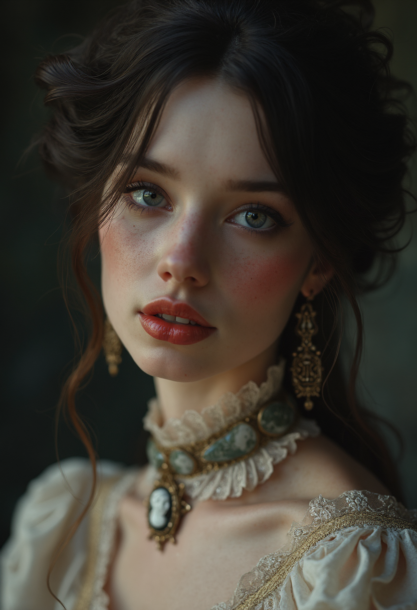 A high-resolution, close-up portrait of a young woman in her early twenties with a soft, innocent expression, exuding a sense of Victorian elegance. She has fair, porcelain skin and wide, doe-like eyes that sparkle with a hint of mystery. Her lips are painted a gentle rose shade, slightly parted to reveal the faintest glimpse of sharp, delicate fangs, hinting at her hidden vampiric nature. Her dark, wavy hair is styled in an elegant Victorian updo adorned with a lace ribbon. She wears a vintage, high-collared dress with intricate lace details and a cameo brooch at her neck, evoking both innocence and old-world charm. The background is dimly lit, with shadows that seem to subtly encroach, adding an eerie, gothic atmosphere to the scene. Soft, diffused lighting highlights her delicate features, casting a gentle glow over her pale complexion, giving her an ethereal, haunting beauty that feels both inviting and unsettling glow effects, godrays, Hand drawn, render, 8k, octane render, cinema 4d, blender, dark, atmospheric 4k ultra detailed, cinematic, Sharp focus, big depth of field, Masterpiece, colors, 3d octane render, 4k, concept art, trending on artstation, hyperrealistic, Vivid colors, extremely detailed CG unity 8k wallpaper, trending on CGSociety, Intricate, High Detail, dramatic intricate, detailed . magnificent, celestial, ethereal, painterly, epic, majestic, magical, fantasy art, cover art, dreamy