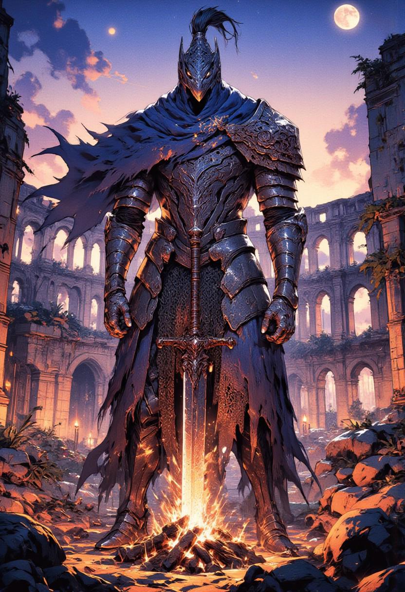 a moody, smooth and dramatic oil painting depicting an extremely detailed FluxArtorias looking at viewer, FluxArtorias with dark colorful surroundings around, he stand at ruined colosseum at night, two moons are on sky, there is campfire with rusted sword driven into fire, artistic, visible brushstrokes, atmospheric haze, pastel palette, moody lighting, side view, <lora:FluxMythP0rtr4itStyle:0.6> mythp0rt <lora:aidmaMJ6.1v0.4:0.6> <lora:Elden_Ring_-_Yoshitaka_Amano:0.33> aidmaMJ6.1