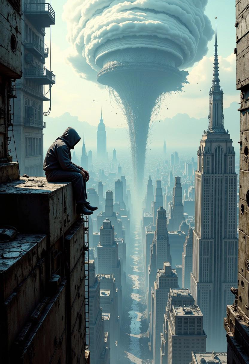 post-apocalyptic cityscape, towering skyscrapers in the foreground, worn and cracked surfaces, a lone hooded figure sitting on the edge of a building, contemplative pose, distant and mysterious vortex-like anomaly dominating the skyline, swirling clouds framing the vortex, atmospheric perspective, intricate urban details with countless high-rise buildings extending into the distance, cold and desolate atmosphere, cinematic composition, wide-angle view capturing the enormity of the setting, surreal and dramatic mood, dystopian architecture with weathered textures, fine balance between realism and science fiction aesthetics.