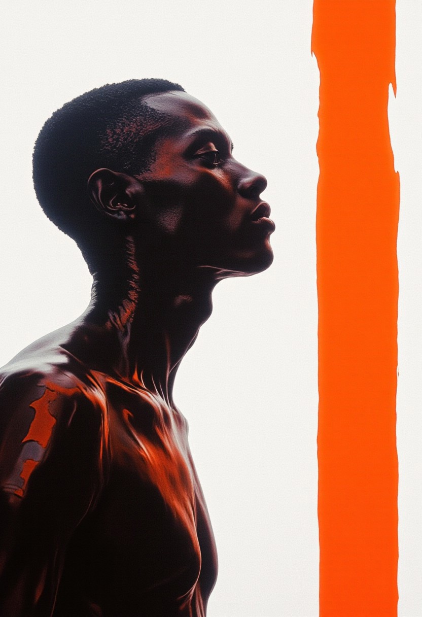 A modern and abstract digital painting featuring a minimalist composition with a monochromatic palette accented by vibrant orange. The central figure is a dark-skinned man with a serene, contemplative expression, his head slightly tilted and eyes closed, framed by short, closely cropped hair. His body, shown from the neck up, transitions from deep black at the top to lighter shades towards the bottom, rendered with a smooth, polished texture that gives a sleek, metallic finish. The stark white background sharply contrasts the dark tones of the figure, while an orange vertical rectangle on the right side introduces a bold and dynamic element. The rectangle’s edges are jagged, adding a sense of energy and movement to the otherwise tranquil composition. The interplay of geometric forms and high-contrast colors draws attention to the figure’s face, creating a striking visual balance. The artwork conveys calm introspection with a modern aesthetic, blending simplicity and boldness to evoke a powerful emotional response. aesthetic_pos3
