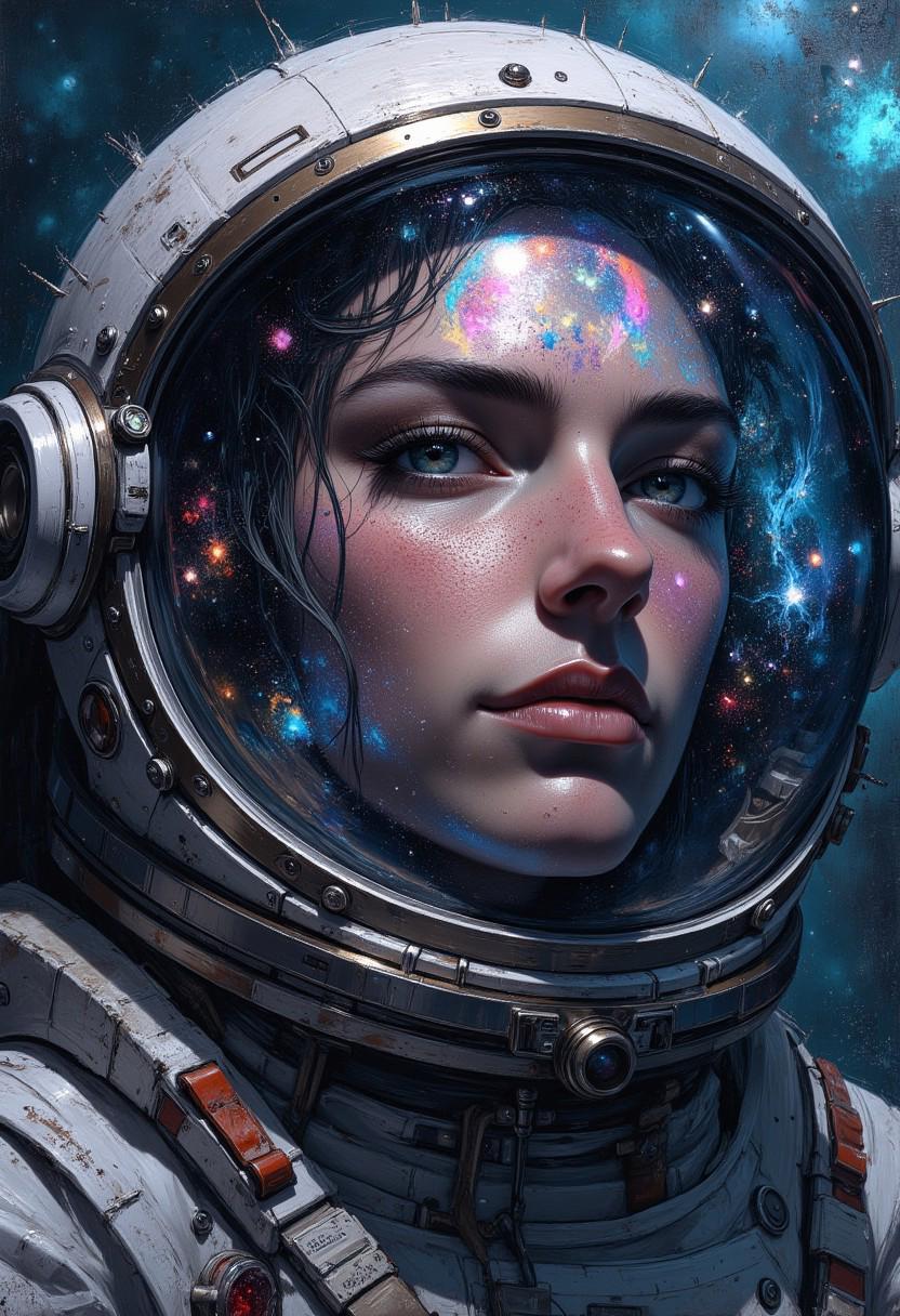 a moody, smooth and photorealistic oil painting showing a close-up of an astronaut's helmet with a colorful spiral galaxy reflected in it, outer space is visible in the background, the whole thing is extremely detailed, close-up, visible brushstrokes, atmospheric haze, pastel palette, moody lighting <lora:FluxMythP0rtr4itStyle:0.6> mythp0rt <lora:aidmaMJ6.1v0.4:0.6> <lora:Elden_Ring_-_Yoshitaka_Amano:0.33> aidmaMJ6.1