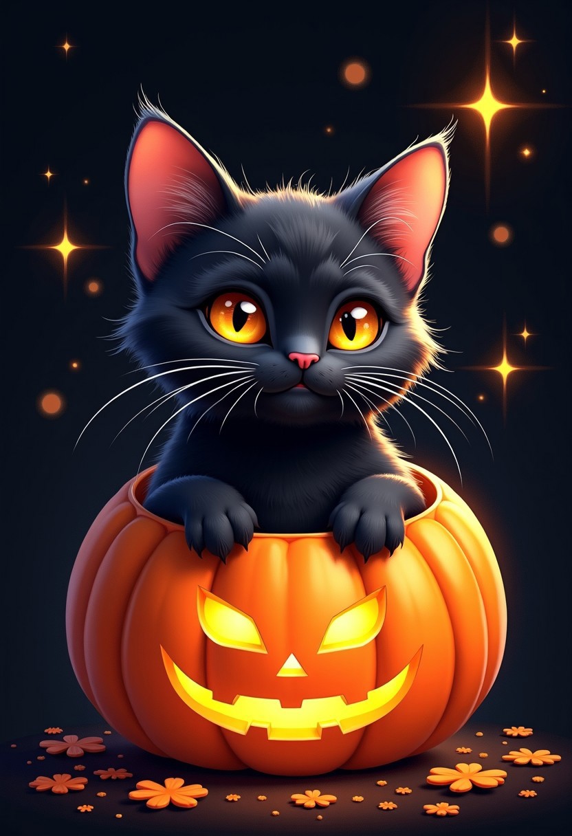 drawn, cartoon, colorful, an image of 8k image, professional, a black cat wearing a giant pumpkin costume, cathead inside pumpkin, magical, mysterious, majestic atmosphere, looking to viewer, sparkle in its eyes, black background, BREAK, its eyes are intense and radiant, with a mysterious shine that captivates viewers, BREAK, BREAK, Overall, the portrait conveys a feeling of magic, strength and deep connection to a magical moment, Ink stains everywhere, cuteness overload, happy halloween theme