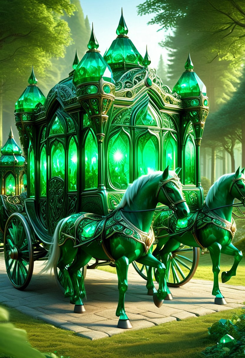 score_9, score_8_up, score_7_up, emeraldmorph, ornate elven carriage, pulled by emerald-winged horses, intricate carvings, glowing lanterns, fantasy forest setting, dynamic lighting, high detail, magical atmosphere