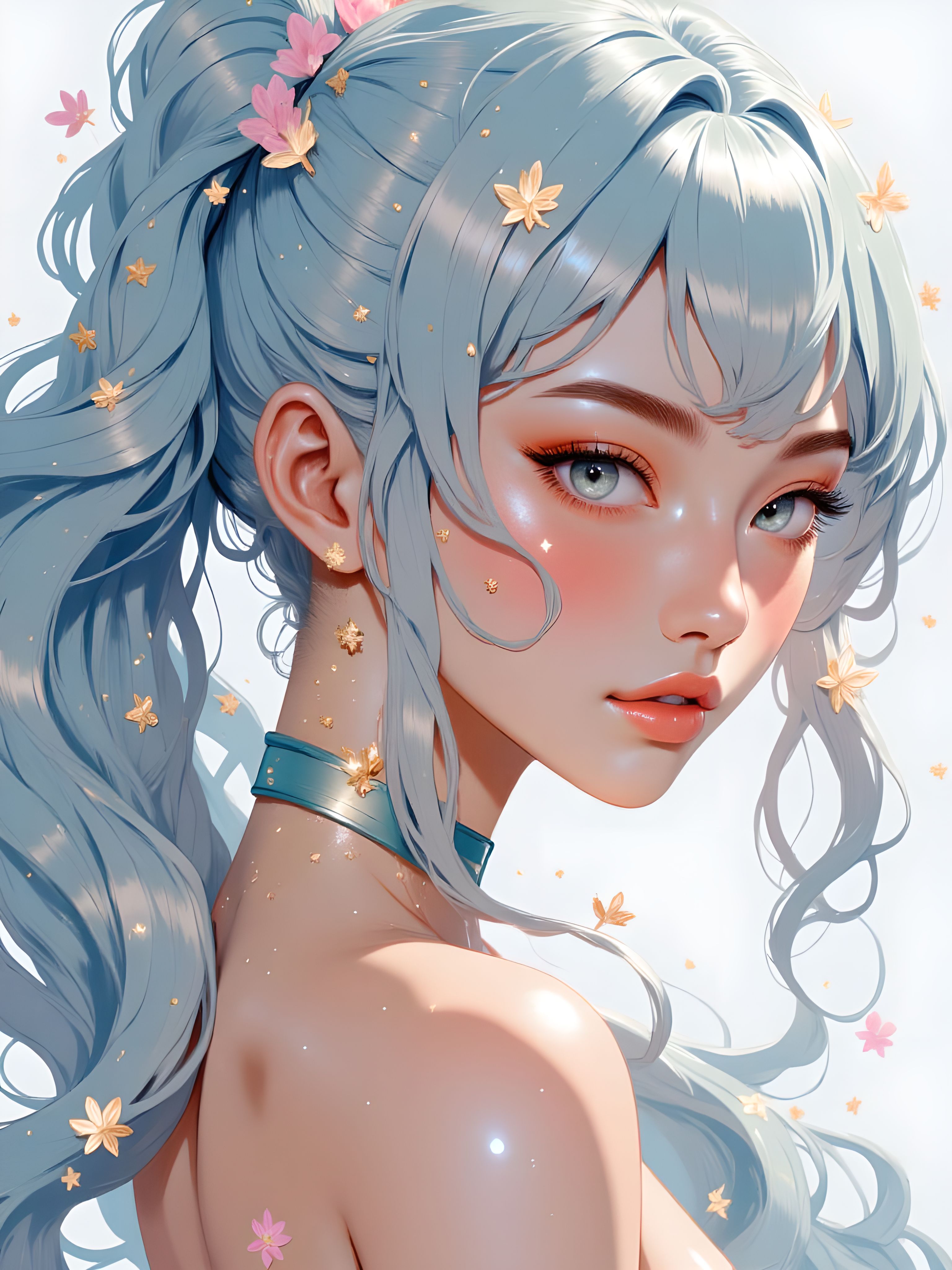 Create a photorealistic illustration of Ayaka, capturing her in ultra-high resolution with the best quality. She should be depicted as a 21-year-old Japanese girl with uncovered, shiny skin that reflects light beautifully, emphasizing her delicate features. Her hair should be styled in a light blue ponytail, showcasing its flowing texture and ethereal quality. Focus on her high-detailed skin, ensuring visible pores and realistic texture, while her face should express a haunting smile with moist lips and watery eyes, enhancing her adorable and playful demeanor. aidmaimageupgrader, aidmaMJ6.1m, detailmaximizer, mythp0rt <lora:aidmaImageUpgrader-FLUX-V0.2:1.0> <lora:flux.1_lora_flyway_Epic-detail_v2:0.8> <lora:aidmaMJ6.1_aidmaMJ6.1-FLUX-v0.4:0.6> <lora:v1v1dr34m:0.7> <lora:mythp0rt_FluxMythP0rtr4itStyle:0.7> <lora:Dreamy_Illustrations_FLUX_LoRA-000001:0.7>