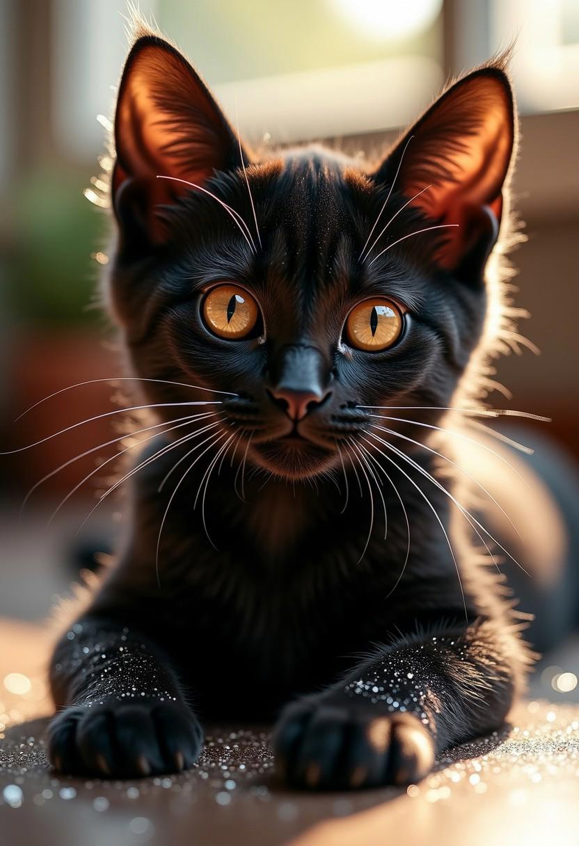 The cat's fur, normally soft and natural, is now covered in a fine, shimmering layer of glitter that catches the light with every movement. The glitter is subtle, adding a magical and almost ethereal quality to its appearance without overwhelming its natural beauty. The cat’s coat still retains its original color, sleek black, but the glitter enhances the fur with delicate sparkles that appear to dance as the cat moves. Its bright, wide eyes are focused, reflecting the glitter around it, while its whiskers stand out, slightly damp with a hint of sparkle. The light surrounding the cat is soft, like during the golden hour, casting long shadows and giving the glitter an even more mesmerizing glow. The background is a soft, natural setting a cozy living room. The sunlight gently filters through a window, causing the glitter on the cat’s fur to shimmer as it lounges or plays. Some of the glitter seems to have settled on the floor, creating a subtle trail behind the cat, adding to the magical effect.