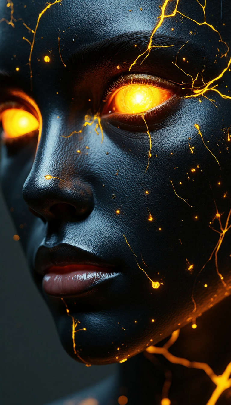 This image portrays a compelling, futuristic character that feels alive with restrained energy. The glowing gold eyes and accents against the metallic black skin create a striking contrast, emphasizing themes of power, transformation, and the interplay between darkness and light. The intricate textures and patterns add to the narrative of a being that is both human and transcendent, evoking mystery and awe.