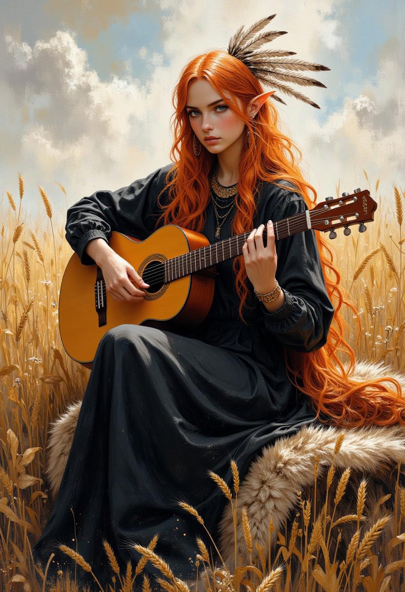 a moody, rough and dramatic oil painting depicting a girl sitting on a fur in the wheat meadow, playing the guitar, she has a black long dress, elf ears, she has wavy long red hair, she has indian plume on head, sunny, visible brushstrokes, atmospheric haze, pastel palette, side view, low key, moody lighting <lora:FluxMythP0rtr4itStyle:0.6> mythp0rt <lora:aidmaMJ6.1v0.4:0.6> <lora:Elden_Ring_-_Yoshitaka_Amano:0.33> aidmaMJ6.1