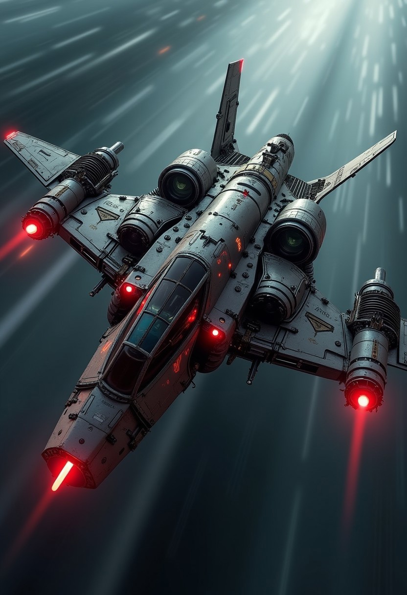 A digital artwork in the style of cknc, armored futuristic fighter plane, adorned with intricate, metallic details, including bolts, wires, and mechanical components, giving it a highly advanced, industrial look, with glowing red diodes and LEDs, travelling at speed through a dark stormy sky, background, viewed diagonally from the front, motion blur, directional lighting