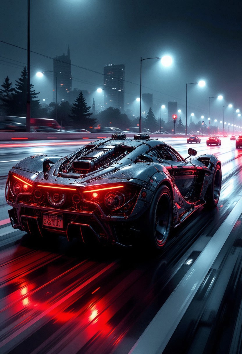 inksketch, silhouette art, chiascuro, a_skynet_cyberdyne_systems_craft, the image is featuring an armored futuristic hypercar, adorned with intricate, metallic details, including bolts, wires, and mechanical components, giving it a highly advanced, industrial look, with glowing red diodes and LEDs, travelling at speed on a cyberpunk superhighway, viewed diagonally from the front, motion blur, in darkness, illuminated by a neon streetlights