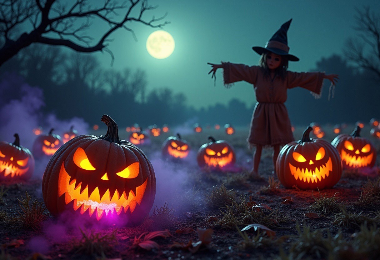 hyper-realistic Halloween scene in a pumpkin field at dusk, where eerie, flux-like energy flows through the air. The pumpkins are large and detailed, some carved with glowing, spooky faces, casting flickering light through their jagged mouths and eyes. A ghostly mist, infused with glowing purple and green flux, weaves between the pumpkins and over the ground, giving the scene a supernatural atmosphere. The field is surrounded by twisted, barren trees, their branches reaching into the darkening sky, with a full moon rising in the background, casting pale light. Scattered autumn leaves and an old wooden scarecrow add to the haunted, mysterious vibe.