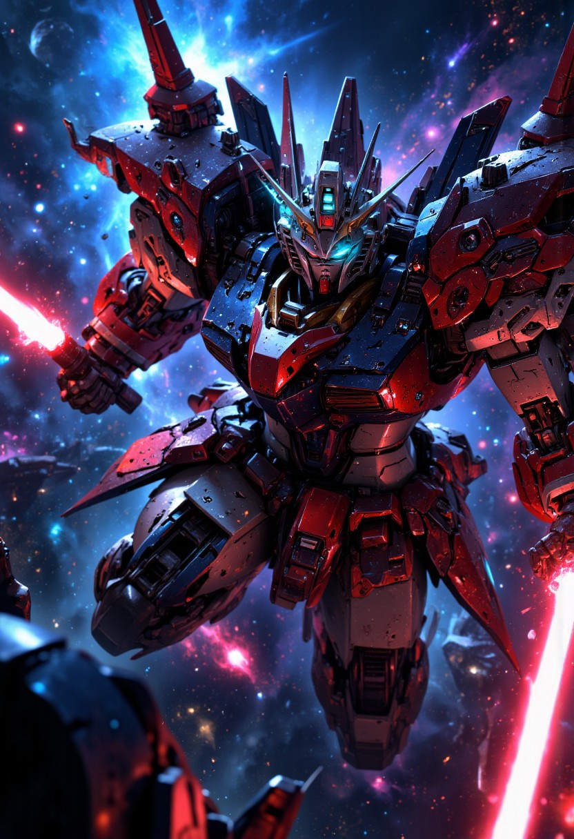 gundam war, (gundam:1.5), war machine, (dramatic angle:1.5), solo_focus, looking at viewer, light_up, vivid, sharp, shine, cinematic_lighting, (all intricate), (best quality), (game CG), holding light saber, canon, laser beam, space, galaxy, war, space ships, precise and powerful, high-tech machinery, sparks flying, mecha, robot, glowing, ef_ffct, (blue,red:1.3)