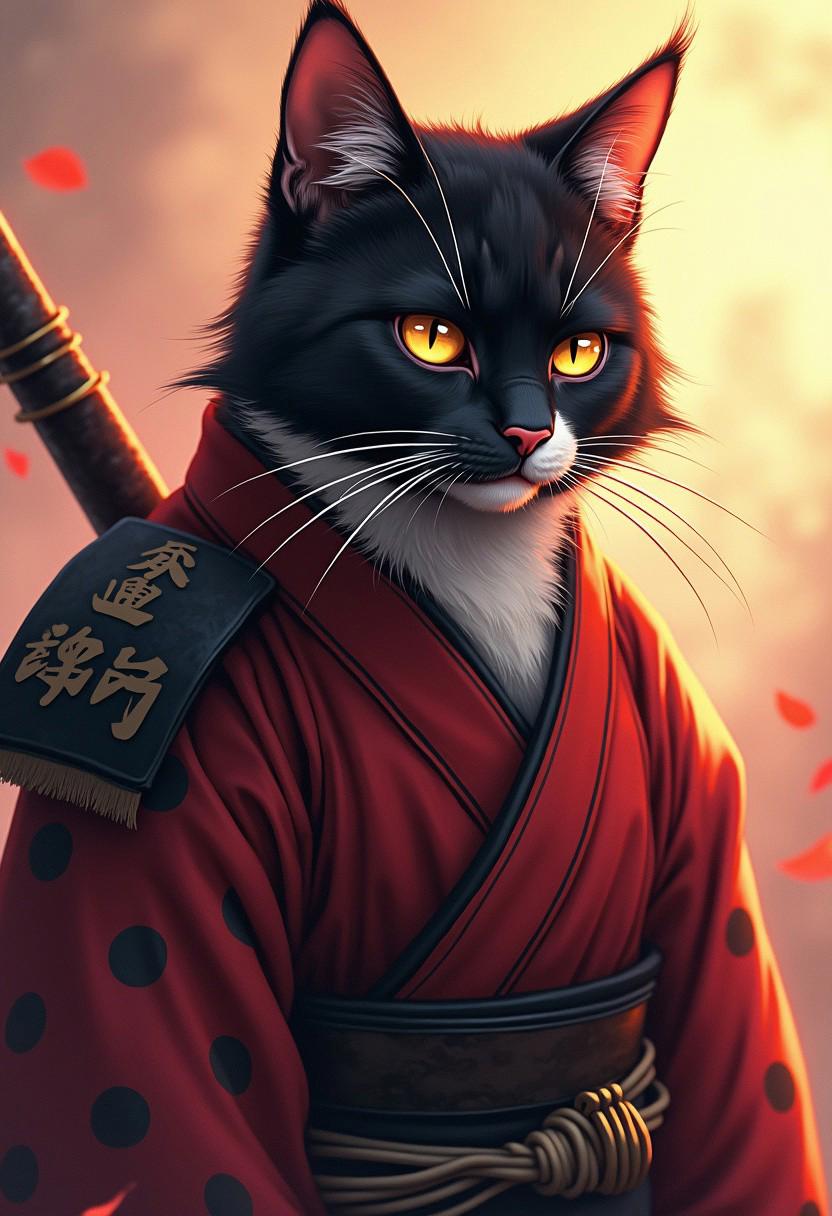 samurai themed cat, anime style, serious
