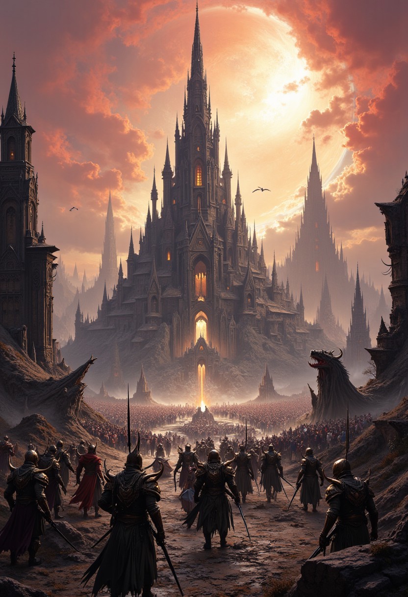 a 85mm/f1.4 canon photo of A twisted landscape of celestial hell features towering spires of obsidian and swirling acrid haze, echoing with the cries of lost souls. Infernal legions of demons march in disciplined ranks. hulking brutes with jagged horns and serpentine forms wield weapons forged from suffering. Clashing metal and anguished wails fill the air, while in the distance looms the Abyssal Throne made of bones, where a Dark Sovereign shrouded in shadows presides. The atmosphere is thick with malice and despair, bathed in a haunting crimson and gold light. celestial hell, demons, infernal legions, obsidian spire, Abyssal Throne, Dark Sovereign, fantasy art, dark fantasy, horror, all infuse this stark place