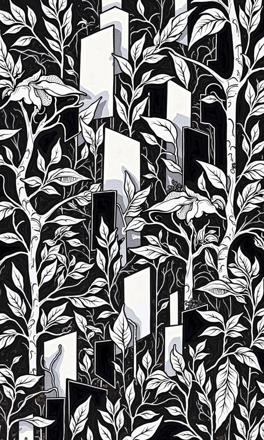 Full black and white abstract graphic design. The design features a dense, intricate pattern of stylized shapes and forms that appear to represent plants, buildings, and other symbolic elements. The shapes are geometric and organic, with sharp lines and bold outlines. The overall composition suggests a complex, layered landscape or cityscape. The forms are densely packed, creating a feeling of depth and visual complexity. The use of black ink fills the entire space, with no white areas. The varied shapes, sizes, and placements of the imagery create a strong visual rhythm and sense of movement. <lora:FLUX-daubrez-DB4RZ-v2:1> DB4RZ, DB4RZ style painting
