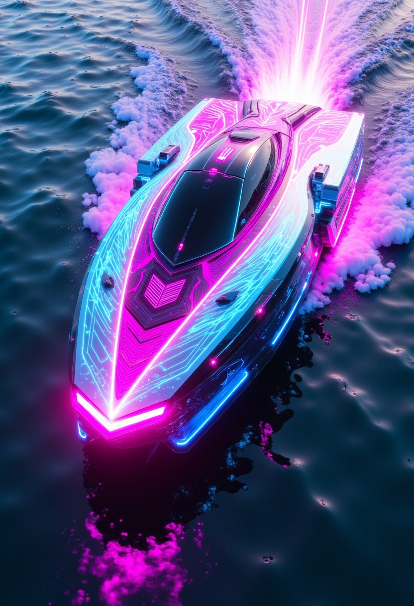 ck-rw, in the style of ck-rw, image of vibrantly-coloured, highly advanced speedboat moving rapidly over the ocean the hull is a flat wedge-shape with a square front, the cockpit shows glowing led lights, and has a large air intake