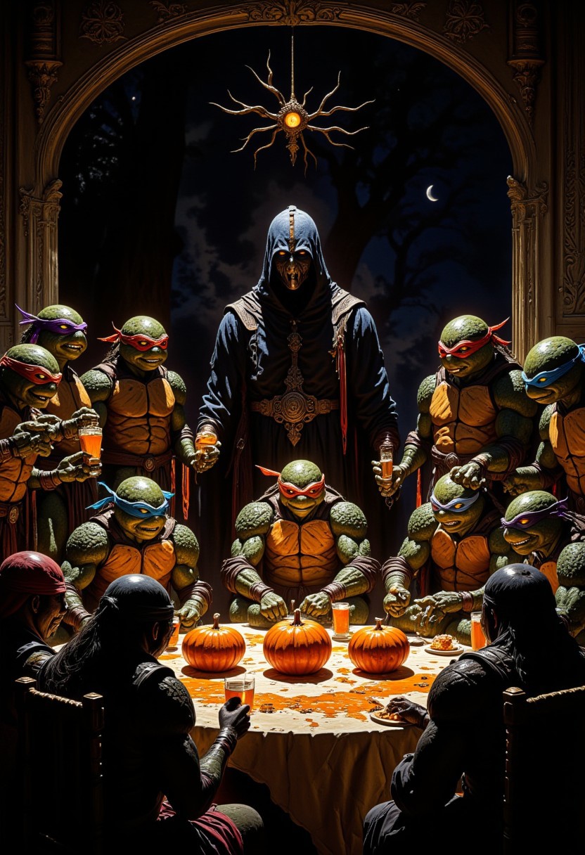 Gathering of The ninja turtles celebrating Halloween, creepy, live action, all the turtles are gathered, the blue mask the red mask the orange mask the purple mask, splinter and shredder is there to, they have pumpkins and drinks, in the style of an old 80's VHS dark fantasy, VHS screen grab, grainy, old footage, in the style of an old 80's VHS dark fantasy, VHS screen grab, grainy, old footage