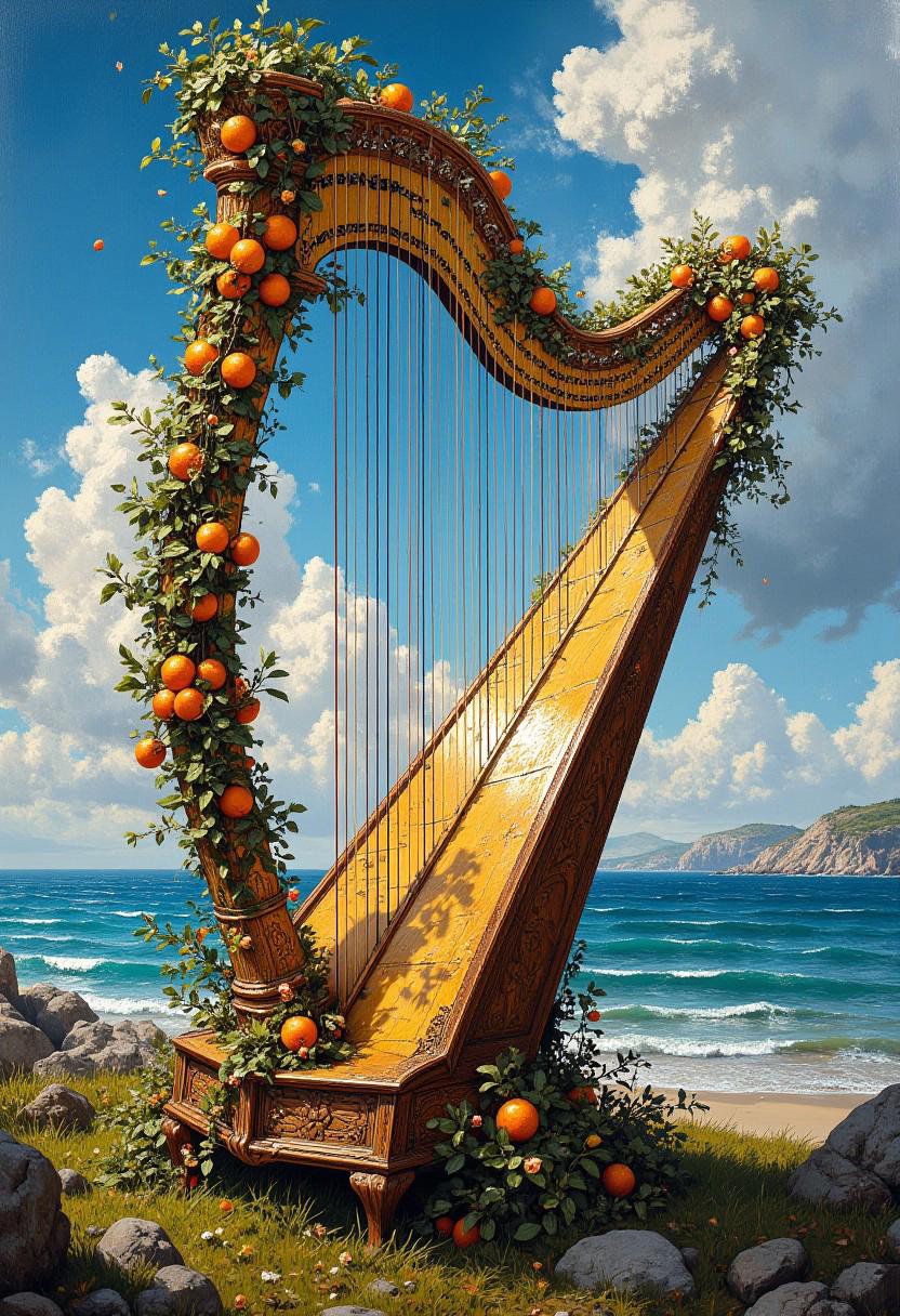 a moody, rough and dramatic oil painting depicting a large golden harp, beautifully decorated and covered with an orange tree and flowers, the harp stands on the grass and in the background you can see the sea and a beautiful blue sky full of clouds, visible brushstrokes, pastel palette, moody lighting <lora:FluxMythP0rtr4itStyle:0.6> mythp0rt <lora:aidmaMJ6.1v0.4:0.6> <lora:Elden_Ring_-_Yoshitaka_Amano:0.33> aidmaMJ6.1